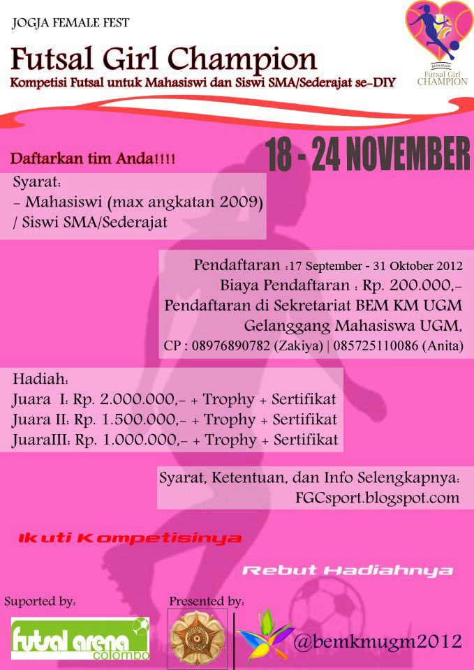 Jadwal TM Pertandingan Futsal Girl Champion : Rabu, 14 November 2012 pukul 16:30 sore di ruang sekretariat BEM KM UGM di Gelanggang Mahasiswa UGM.
